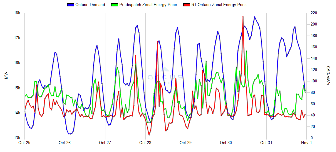 | RT Ontario Zonal Energy Price [Peak HE8-HE23] | 31-Oct | 15.30 | 39.18 | 172.56 | -38.80 |