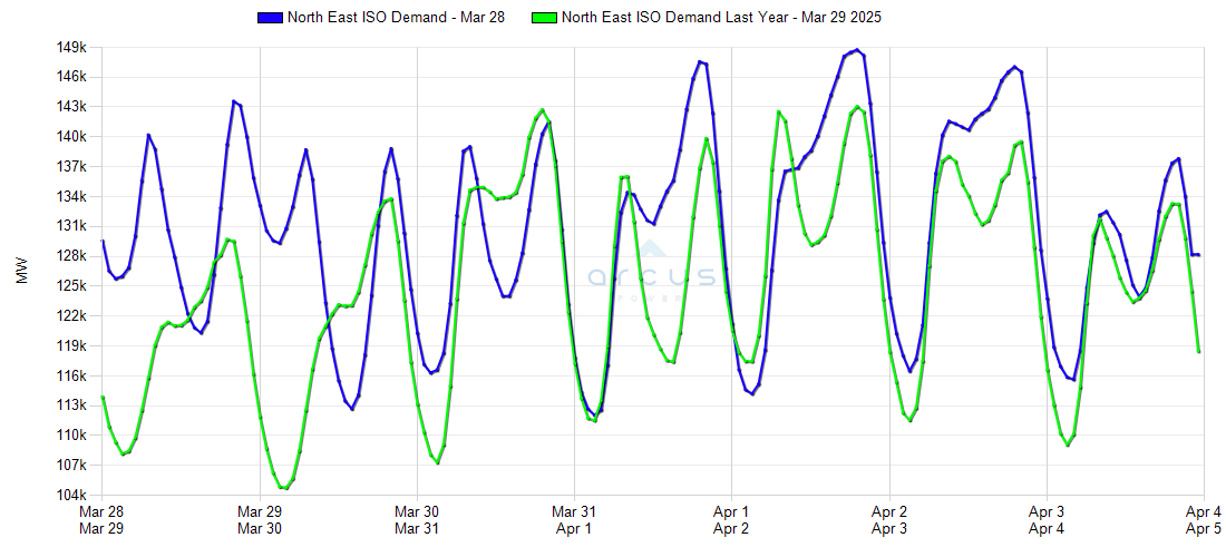 | North East ISO Demand - NYISO PJM-RTO NEPOOL ONIMO | 03-Apr | 115,664 | 127,357 | 137,831 |