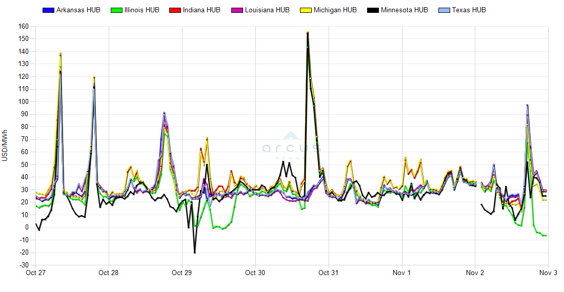 | Arkansas HUB DAM LMP [Peak HE7-HE22] | 03-Nov | 21.70 | 35.10 | 57.90 | 3.90 |