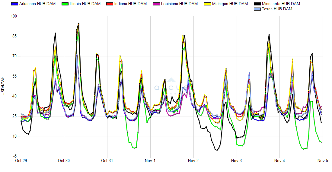 | Minnesota HUB DAM LMP [Peak HE7-HE22] | 04-Nov | 23.37 | 36.01 | 72.13 | -5.16 |