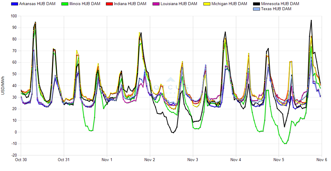 | Minnesota HUB DAM LMP [Peak HE7-HE22] | 05-Nov | 20.48 | 42.31 | 96.35 | 6.30 |