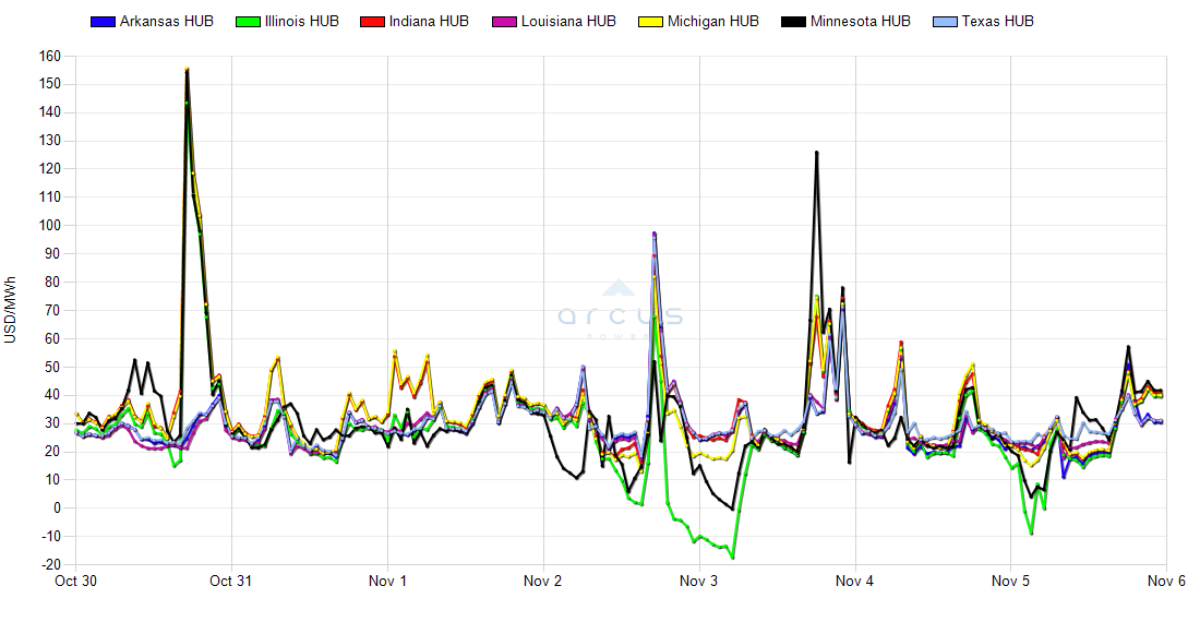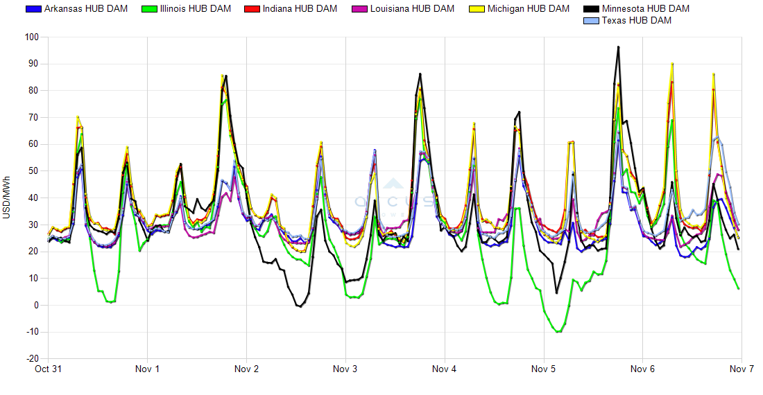 | Minnesota HUB DAM LMP | 06-Nov | 21.06 | 29.93 | 45.97 | -5.65 |