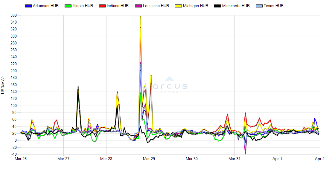 | Arkansas HUB DAM LMP [Peak HE7-HE22] | 02-Apr | 22.68 | 29.47 | 44.66 | 1.20 |